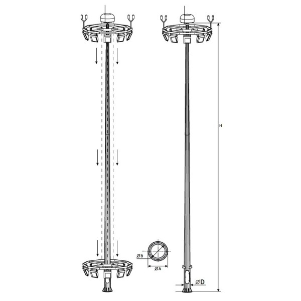 Высокомачтовые опоры освещения, предназначенные для монтажа большого количества светильников (до 12) на высоте, позволяющей увеличить их продуктивность и площадь охвата. Опоры ВМО-35-В заменяют собой сразу несколько стандартных опор освещения, что позволяет полностью окупить их увеличенную стоимость, связанную не только с большой металлоемкостью, но и со сложной организацией конструкций. При этом такие металлоконструкции отличаются оптимальным для своих габаритов весом, не создают излишней нагрузки на грунт, могут быть использованы для подземного подвода кабельной системы, что позволяет отказаться от протягивания дополнительных проводов. Системы используются на стадионах, на промышленных площадках и т.д. Их гармоничный дизайн и современное исполнение, а также возможность обслуживания без привлечения габаритной спецтехники, которой часто требуется специальный подъезд, позволяют использовать их при обустройстве жилых комплексов.